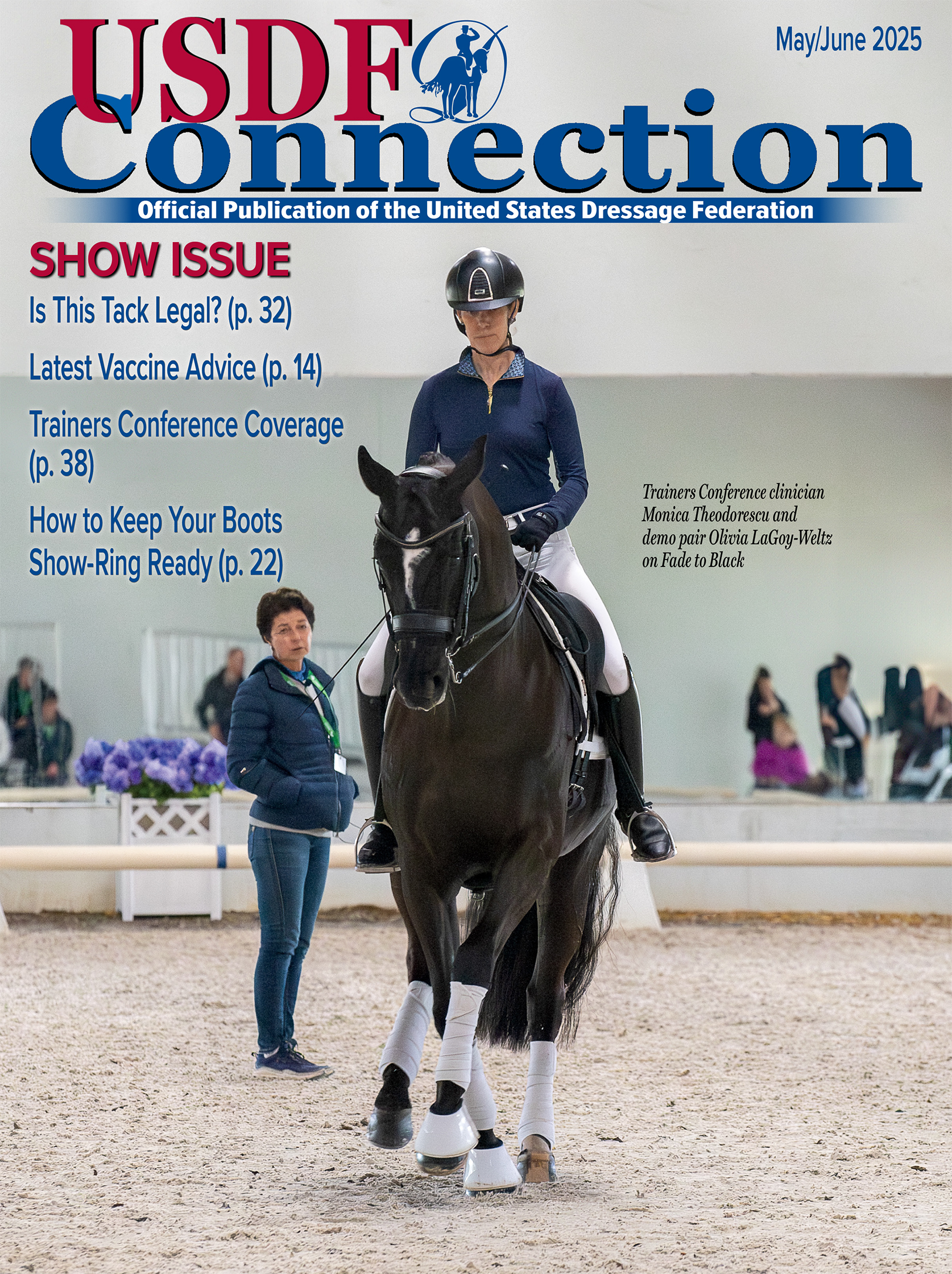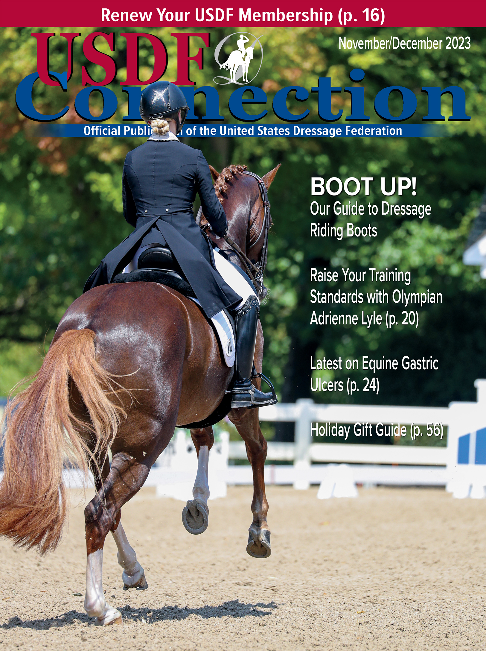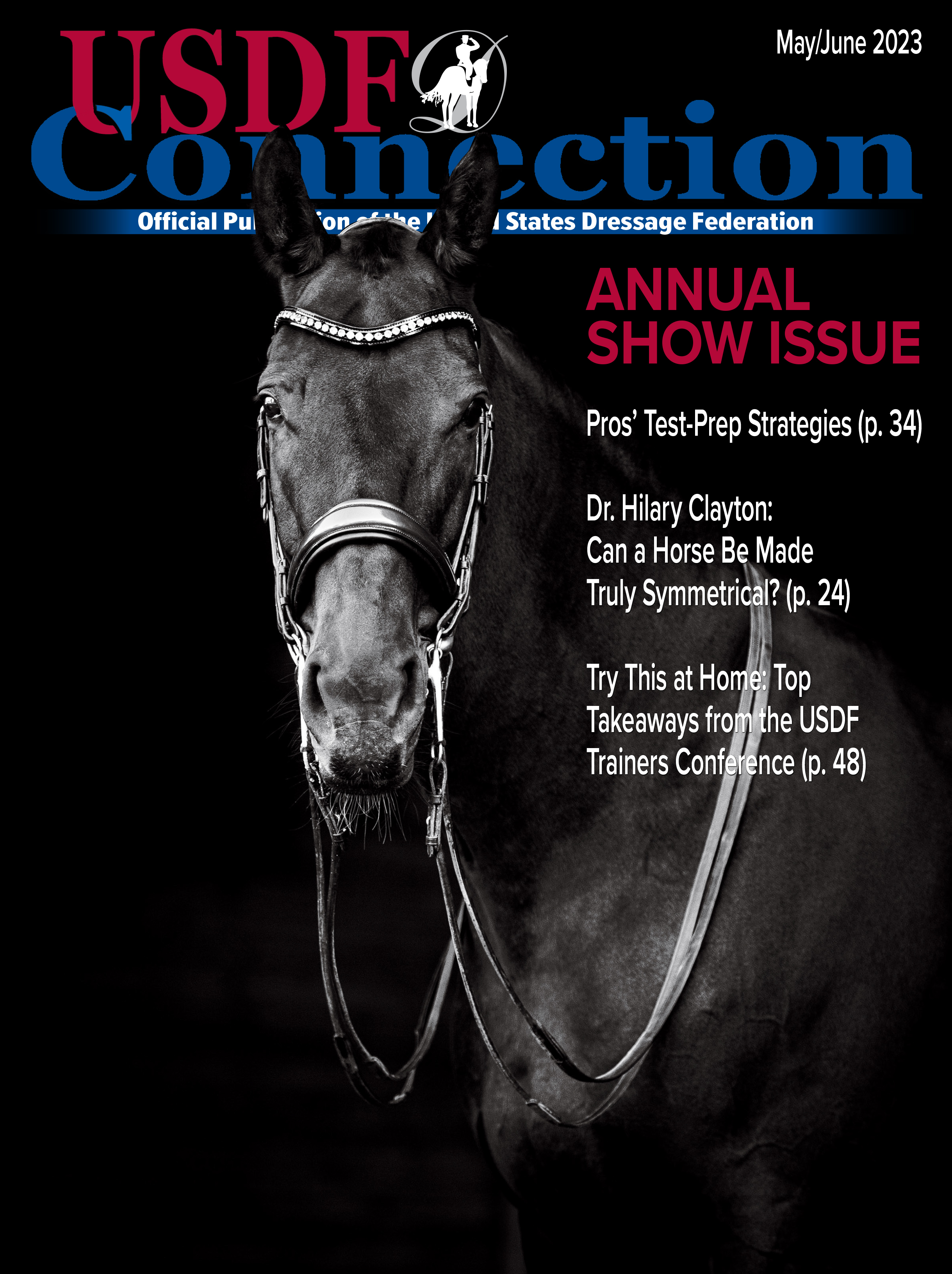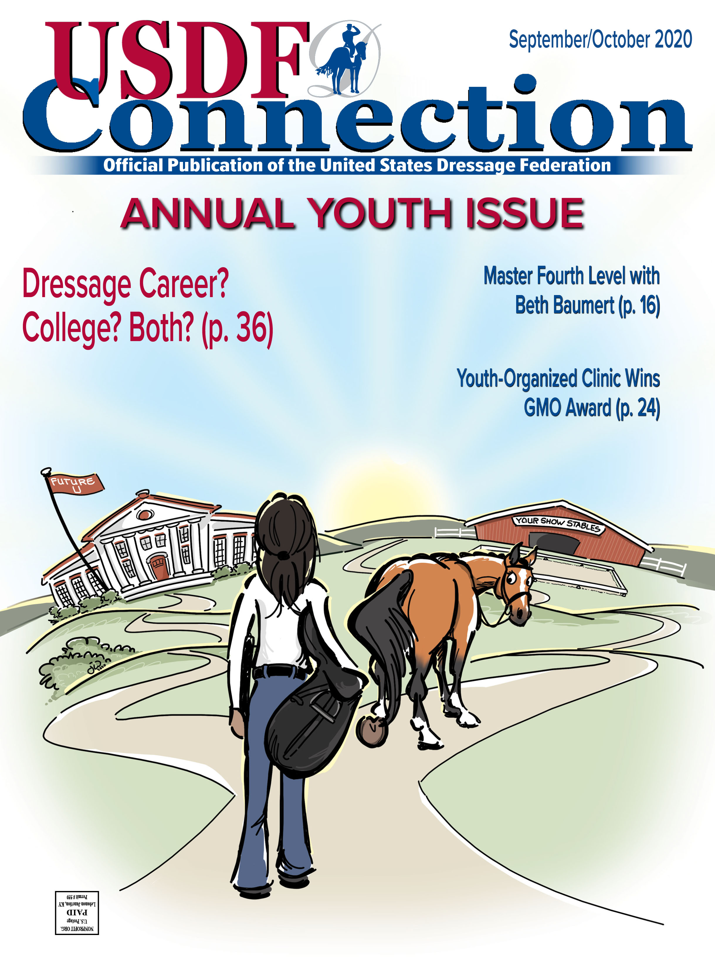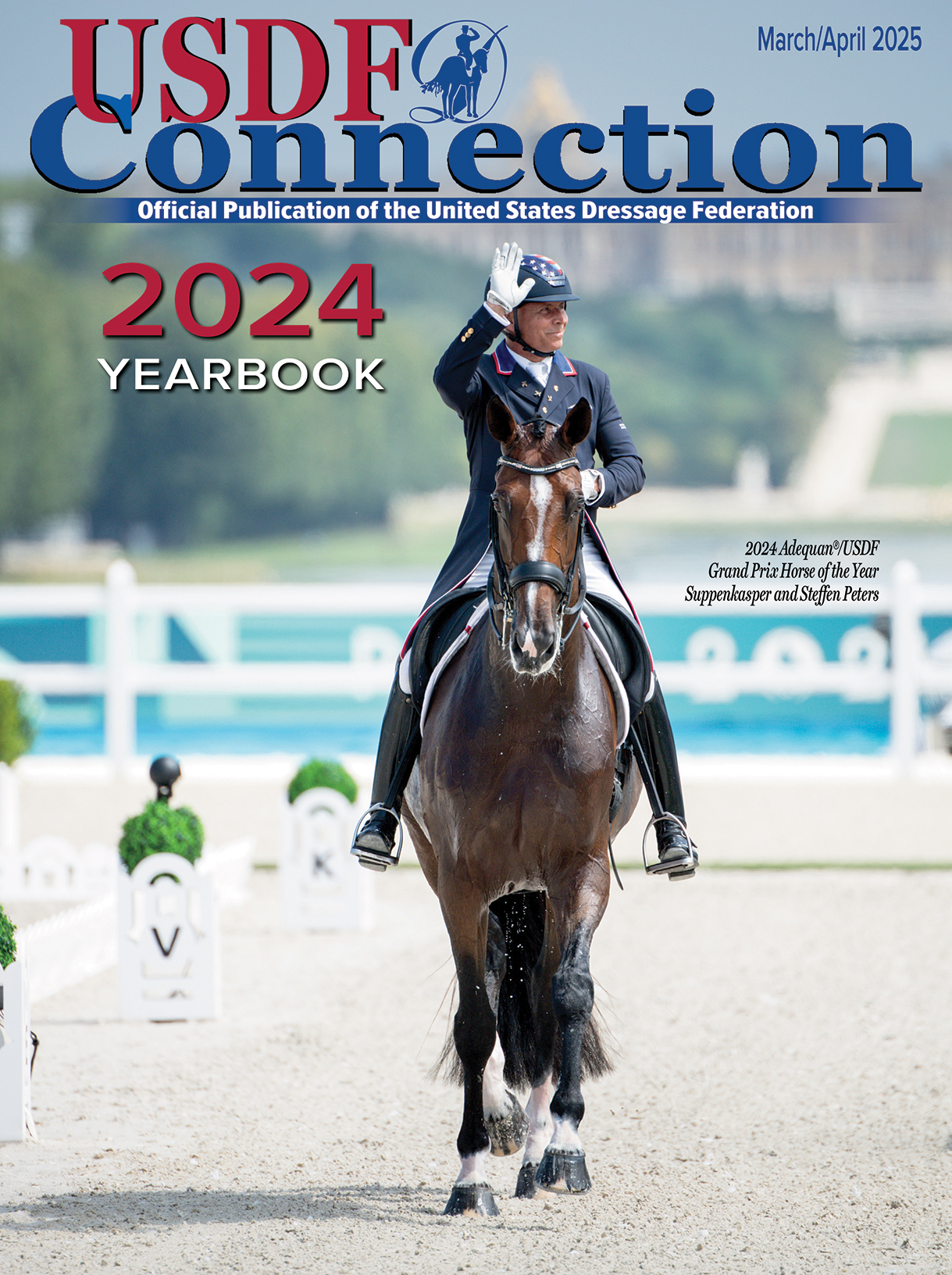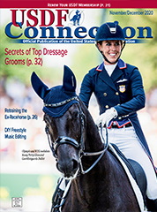 USDF Connection is mailed to members of the federation and subscribers. It offers an informative mix of USDF and American dressage news; a calendar of programs, events and horse shows; educational articles; feature stories; and commentary by many of the most recognized and respected names in dressage.