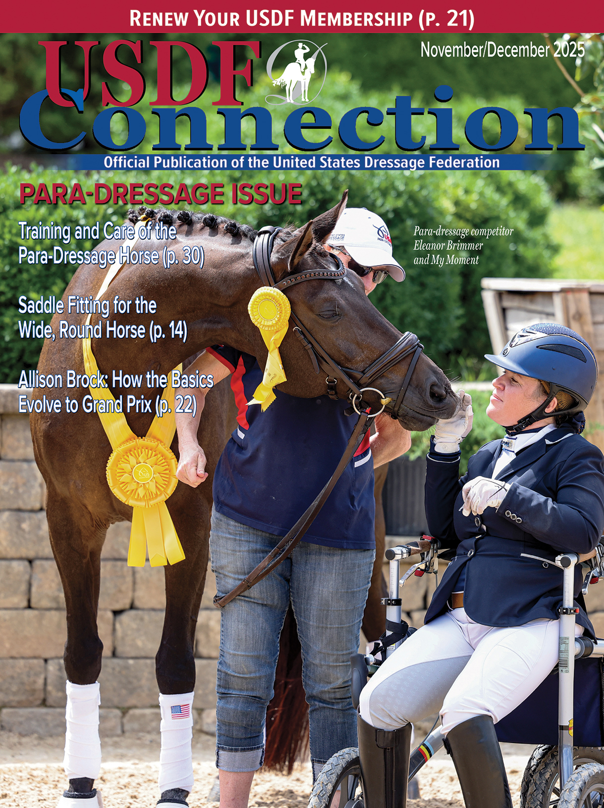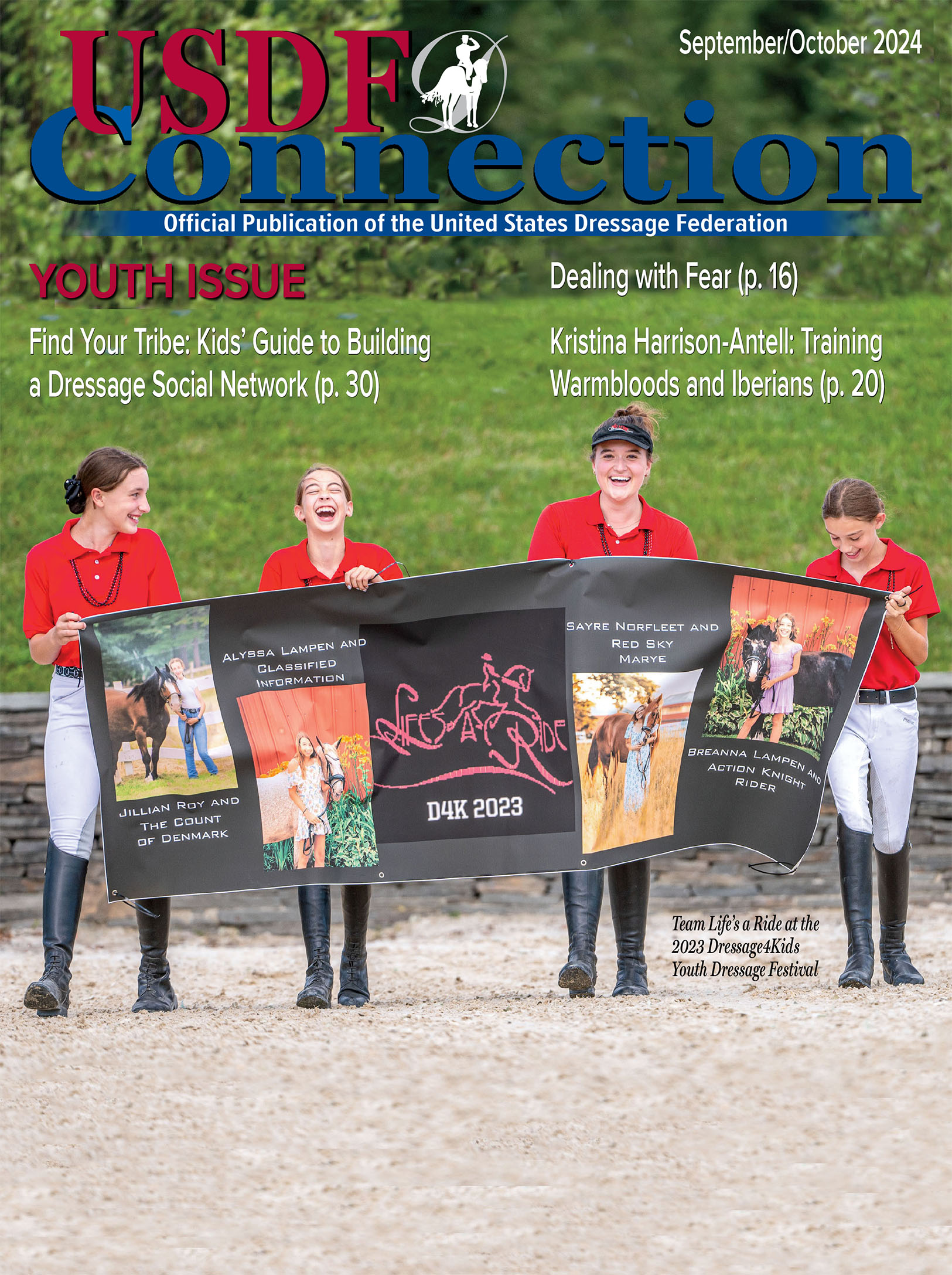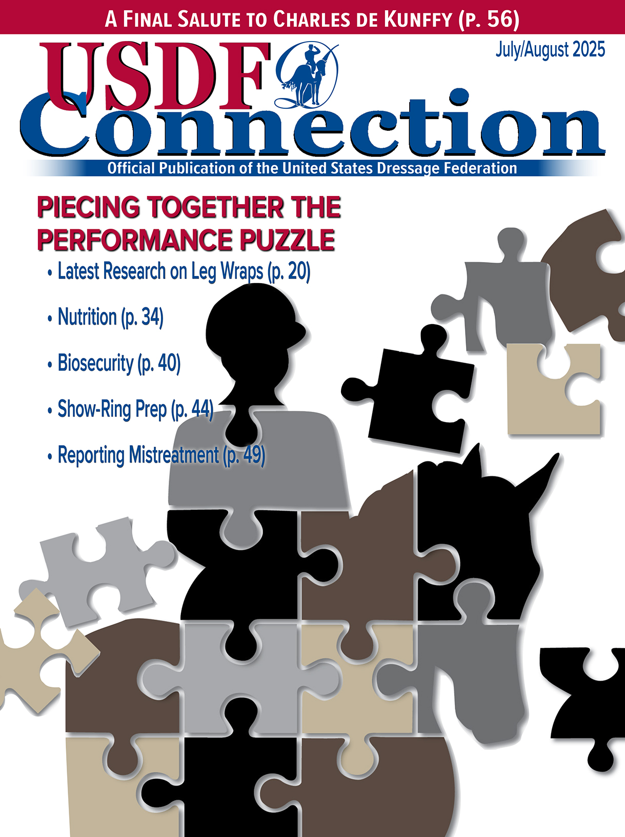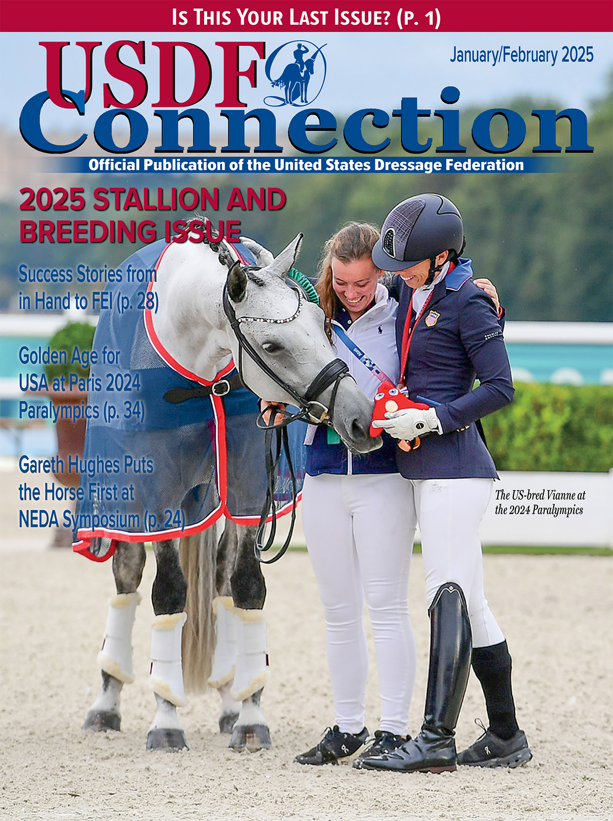 USDF Connection is mailed to members of the federation and subscribers. It offers an informative mix of USDF and American dressage news; a calendar of programs, events and horse shows; educational articles; feature stories; and commentary by many of the most recognized and respected names in dressage.
